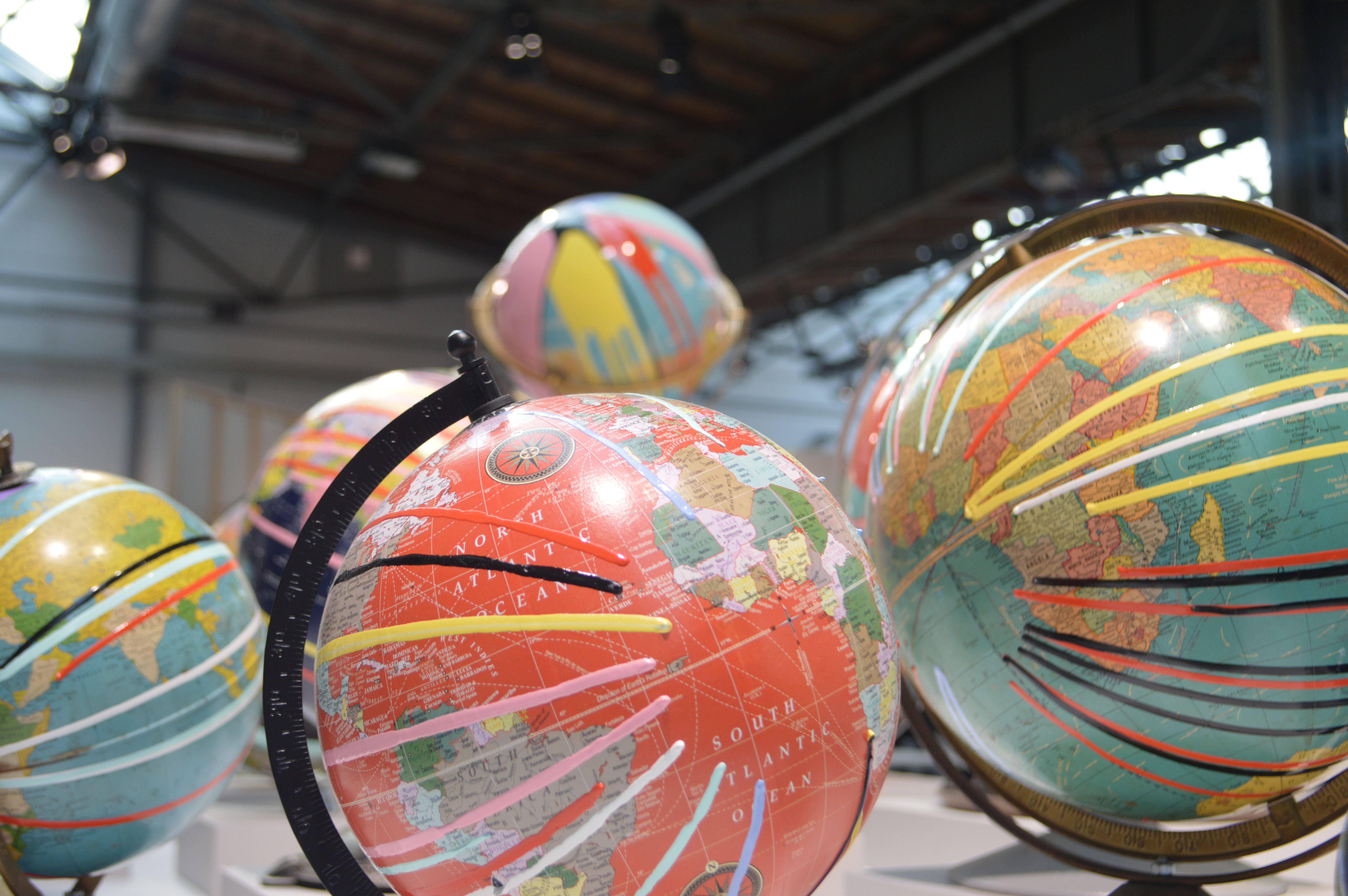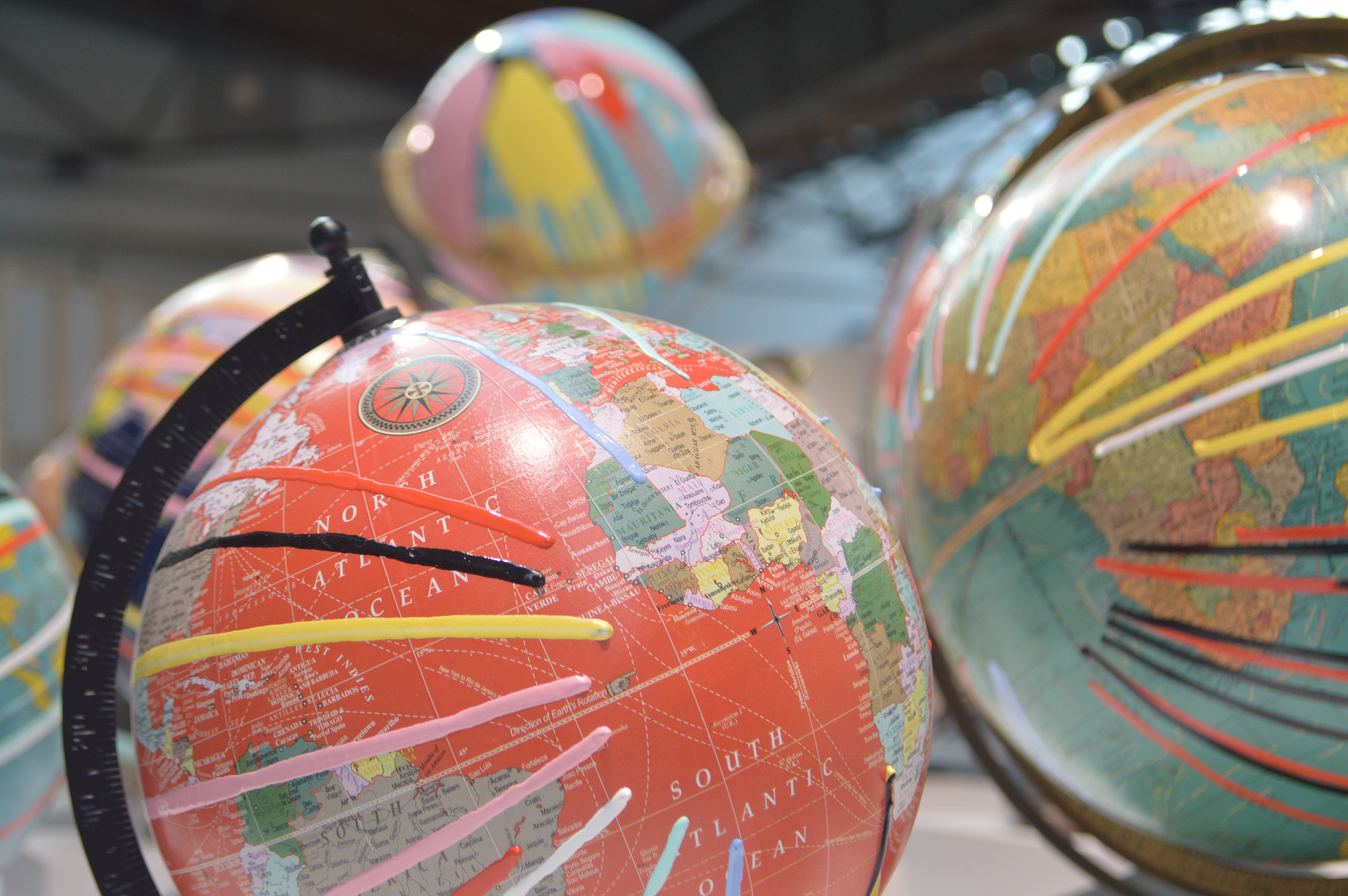 The paint on one of the globes that is spread out from the top of the globe as if it was representing its scars that earth had received during its numerous wars and armed conflicts.